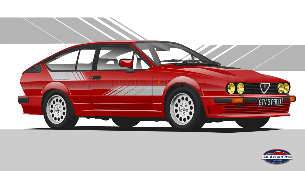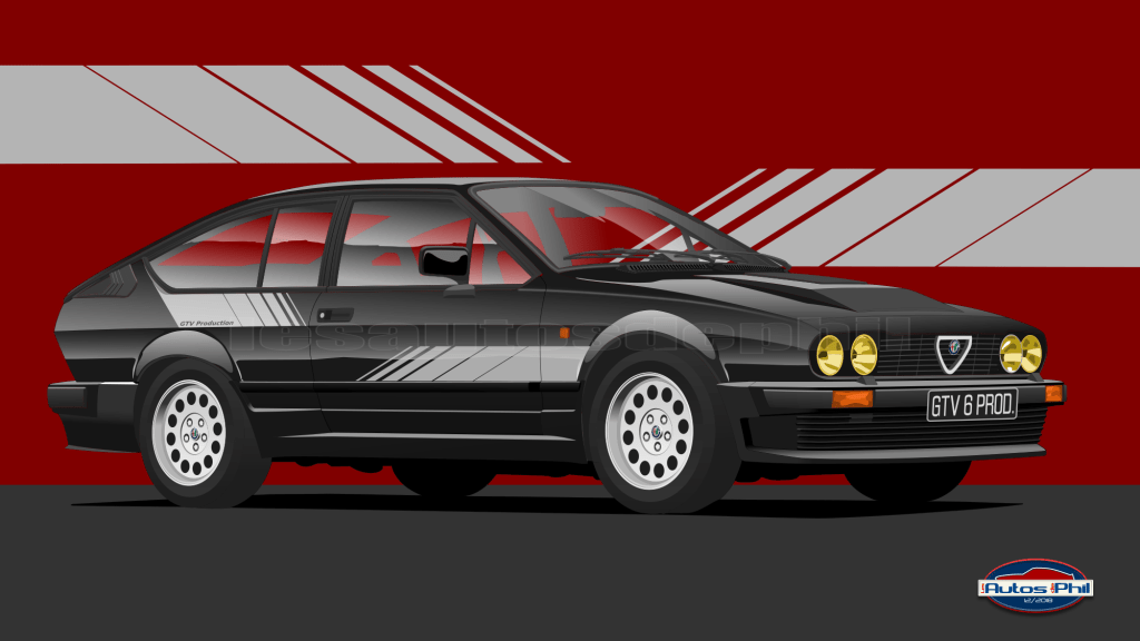 Présentée en novembre 1980, la GTV6 reprend le moteur 6 cylindres, développé par l’ingénieur Busso, proposé pour la première fois sur la grande Alfa 6 en avril 1979. Il va donner une nouvelle dimension aux coupés GT/GTV lancés précédemment en juin 1974 et Alfa-Romeo en profite pour faire une grosse remise à jour esthétique : ainsi, extérieurement de gros pare-chocs en plastiques remplacent ceux plus fin en inox, les feux arrières sont d’un seul tenant au lieu d’être en deux parties et adieu les chromes remplacés par le noir mat. Une évolution finalement typique des années 80 ! Certains regretteront ce passage vers une ligne alourdie et surchargée, mais le style original en coin élaboré par Giugiaro subsiste et c’est bien le principal qui fait tout le charme de ce coupé.