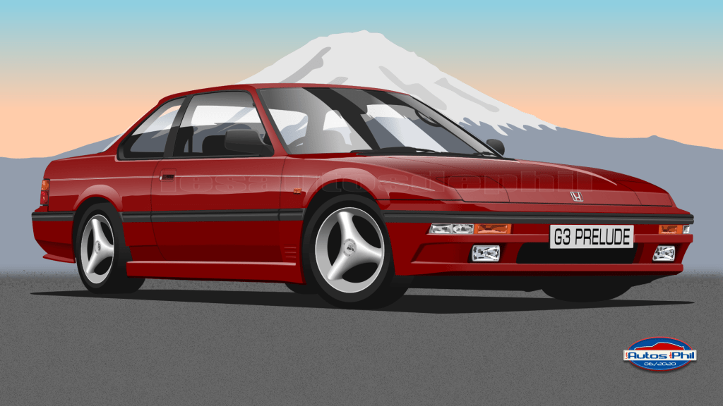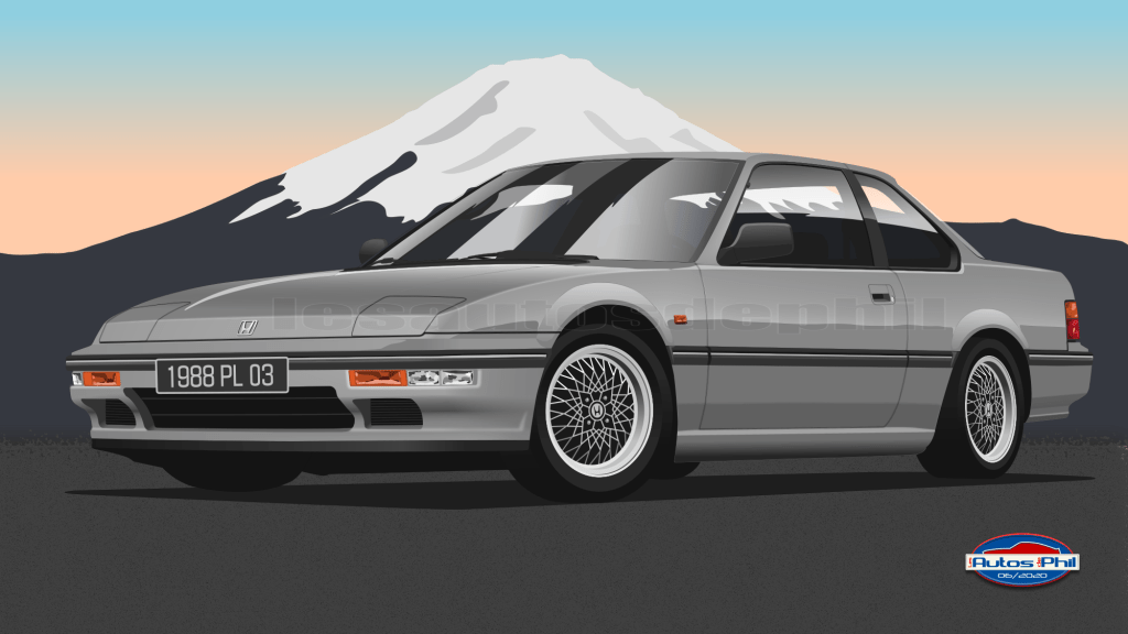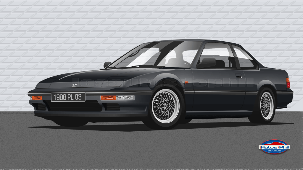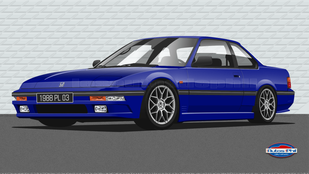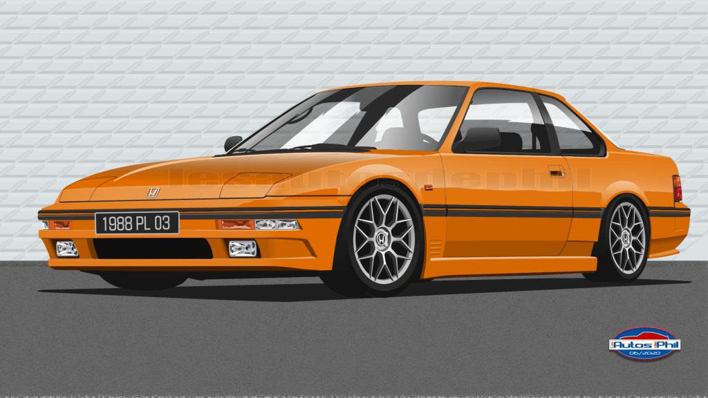 Ceux qui me suivent assidument depuis le début vont sans doute noter qu’aujourd’hui, je propose pour la première fois une voiture non-européenne, en l’occurrence une Japonaise. Le choix va sans doute surprendre car n’étant la plus connue ou populaire en France : la logique aurait voulu que je traite en premier lieu les Datsun/Nissan « Z », Toyota Celica, Nissan Skyline ou autre Honda Civic, modèles qui ont connu un certain intérêt dans notre pays. Mais alors pourquoi cette Prelude ? Eh bien il s’agit tout simplement d’une commande d’un follower Instagram anglais pour lequel j’avais déjà illustré deux 104 coupé : la première déjà en sa possession et la seconde en projet de restauration. Ayant récemment acquis une Prelude 3g, il est revenu vers moi et je dois reconnaître que lorsqu’il m’en a parlé, ma mémoire n’est pas revenue précisément. J’avais bien en tête la toute première génération ainsi qu’une des dernières mais pour la « 3g » (pour troisième génération), j’ai dû surfer sur internet pour me la remémorer. Je connaissais bien sûr ce modèle proposé par Honda entre 1987 et 1991 mais il ne m’a pas marqué plus que ça. Il est vrai qu’à cette époque, j’étais plus porté par les bombinettes qu’étaient les GTI et dans la gamme Honda, la Civic offrait une plastique agréable ainsi que des motorisations très performantes. On se souvient tous du moteur VTEC et bien sûr du coupé CRX qui aura marqué les esprits. Mais revenons à nos moutons : Tom m’a envoyé des photos de son acquisition et je dois reconnaître que je suis tombé sous le charme de cet élégant coupé classique. De plus, le sien est équipé d’un kit carrosserie proposé par le fabricant Allemand « Style Auto » ainsi que de jantes « Antera » à trois bâtons dans le plus pur style bio très en vogue à l’époque. Le tout habillé d’un rouge flamboyant donnant un côté sportif à ce coupé bon chic bon genre ayant la particularité de proposer des phares rétractables. Elle n’aurait pas déparé dans le catalogue de tuning bien connu D&W, avis aux connaisseurs d’outre-Rhin !