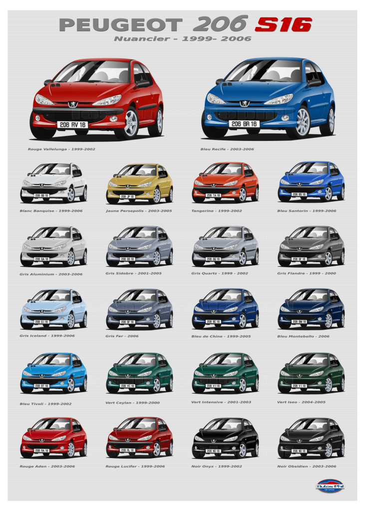 Terminons par les coloris, j’ai découvert avec surprise que l’on pouvait opter, sur la version S16, pour quasiment toutes les teintes proposées au catalogue. Encore une fois en opposition aux pratiques des années 80 où les noir, argent, blanc et rouge étaient rois. Sur l’ensemble de sa carrière, il y avait au total vingt-deux teintes possibles. Eh non, il n’y avait pas que le gris argent ou gris iceland ! Sur la version RC par-contre, seules cinq nuances étaient possibles, Peugeot voulant sans doute donner une certaine exclusivité à son fer de lance et éviter la confusion avec une simple XR. (Cliquez sur les illustrations pour agrandir)