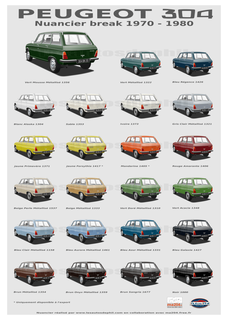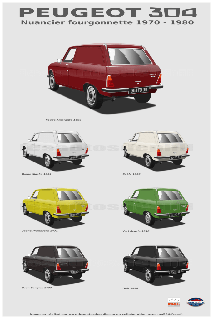 Enfin, pour terminer la série des nuanciers 204/304 et toujours en collaboration avec Pierre du site http://ma204.free.fr/ qui m’a fourni les informations, j’ai réalisé ceux des berline, break et fourgonnette.