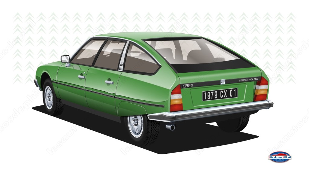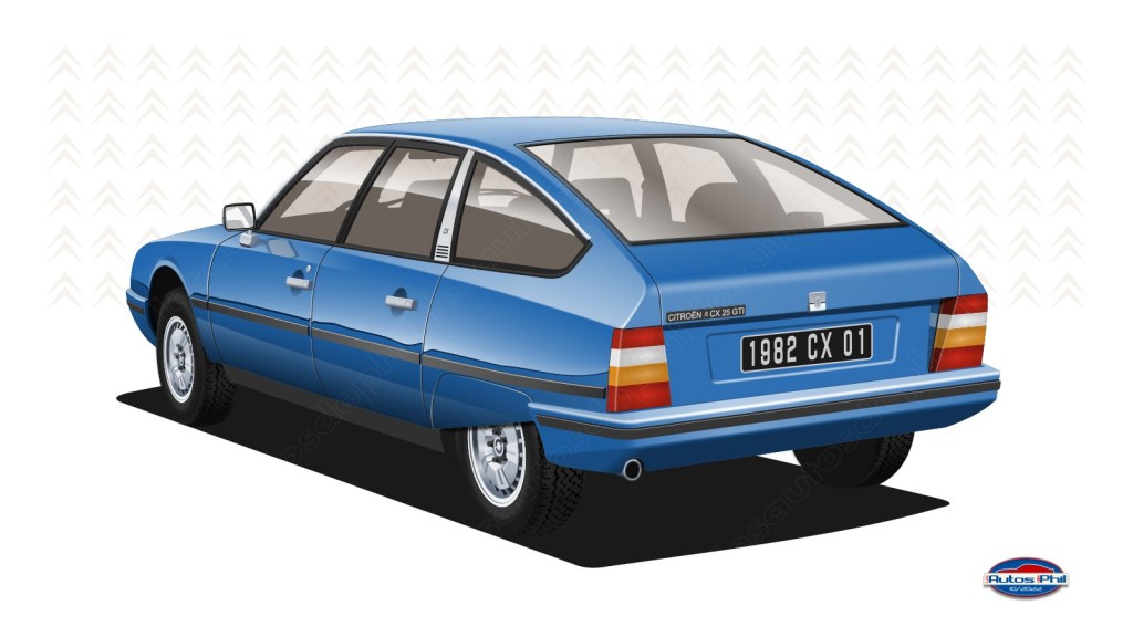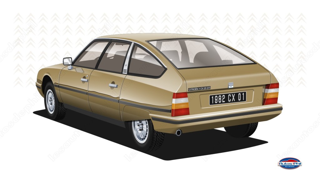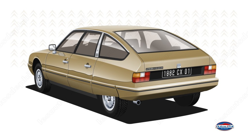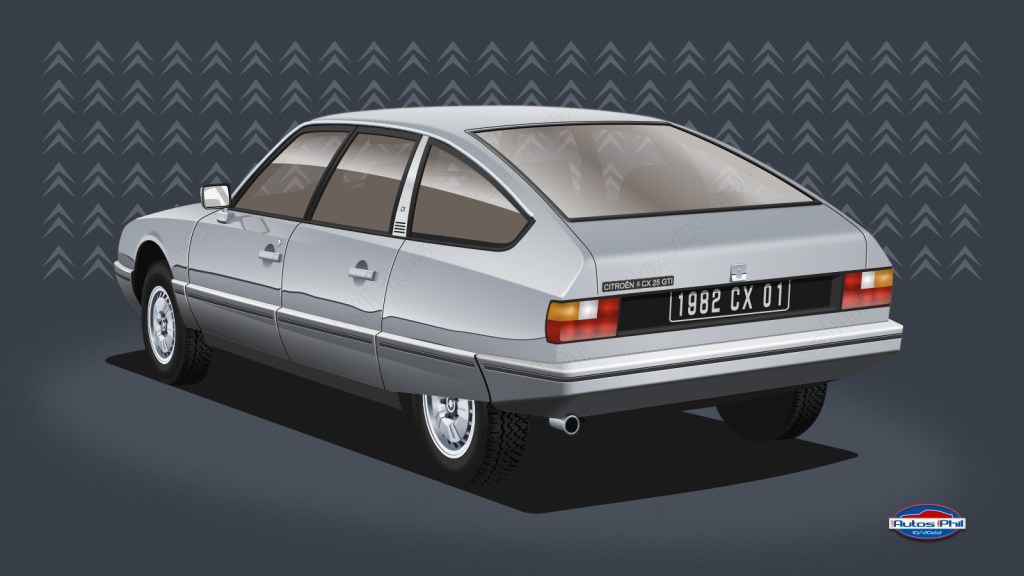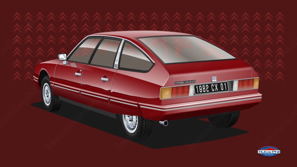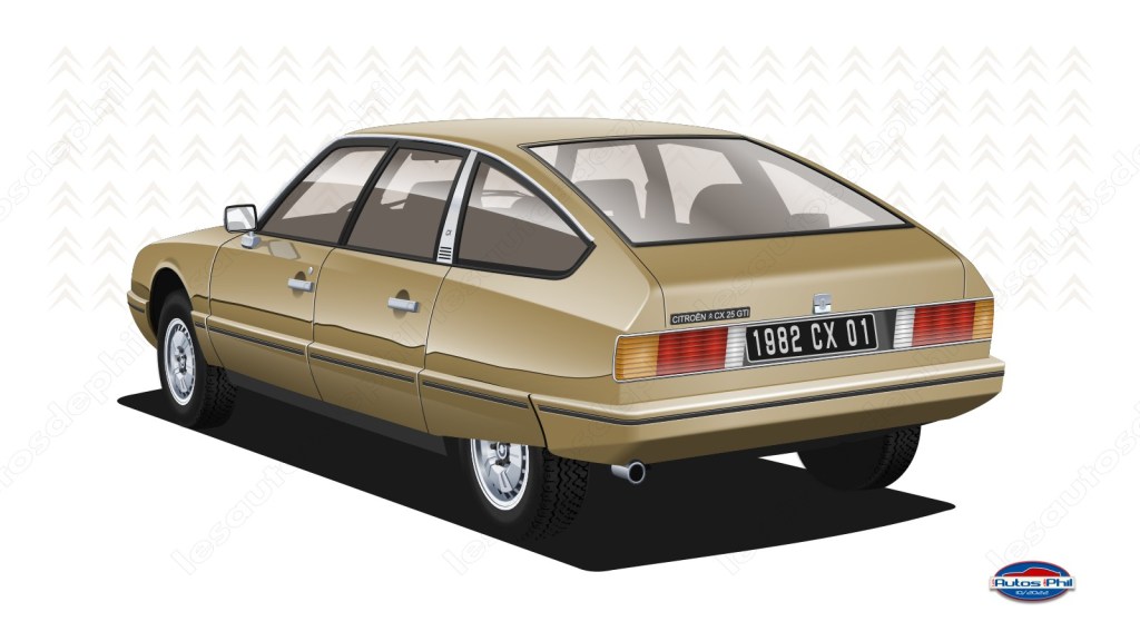 Dans ma jeunesse je remplissais des cahiers entiers de dessins de voitures, inventées ou existantes, avec ou sans modifications, en m’inspirant de ce qui se faisait sur le marché du moment. Lorsque j’ai quitté le cocon familial pour vivre ma vie d’adulte, ces cahiers sont restés chez mes parents qui, au moment de leur retraite, ont changés de logement, j’étais persuadé que mes « œuvres » avaient fait les frais du rangement par le vide à cette occasion. Aussi, quelle ne fut pas ma surprise lorsque, ma sœur, m’appelant en août 2021, me fit part de la (re)découverte de ces dernières dans le grenier parental ! Evidemment, je n’ai pas hésité un seul instant pour lui demander de les prendre avec elle afin de me les remettre à la première occasion et c’est avec un grand amusement que j’ai revu mon travail d’alors. Parmi celui-ci, il y avait plusieurs illustrations de Citroën CX en vue trois quart arrière réalisées à l’encre de chine et proposant différents restylages. N’étant pas datées, je pense les avoirs réalisées en 1985 lors de la remise à jour de la vraie CX. A l’époque, je trouvais les modifications apportées par la marque aux chevrons trop timides, car limitées aux seuls pare-chocs modernisés. De plus, je ne comprenais pas pourquoi les stylistes n’ont pas intégrés un hayon comme ils l’avaient fait avec la GSA. En découle donc la recherche de ma propre vision des choses et lorsque j’ai revu ces dessins, il faut bien l’avouer, de qualité moyenne, je me suis dit qu’il serait intéressant de les refaire avec mon logiciel et de les partager avec vous, sachant que parmi mes lecteurs, certains apprécient ce genre d’uchronies ! Il y a sans doute des puristes qui vont crier au scandale en voyant ces propositions, à ceux-ci, je les invite à lire l’article jusqu’au bout et à me faire leur commentaire à l’issue de leur lecture.