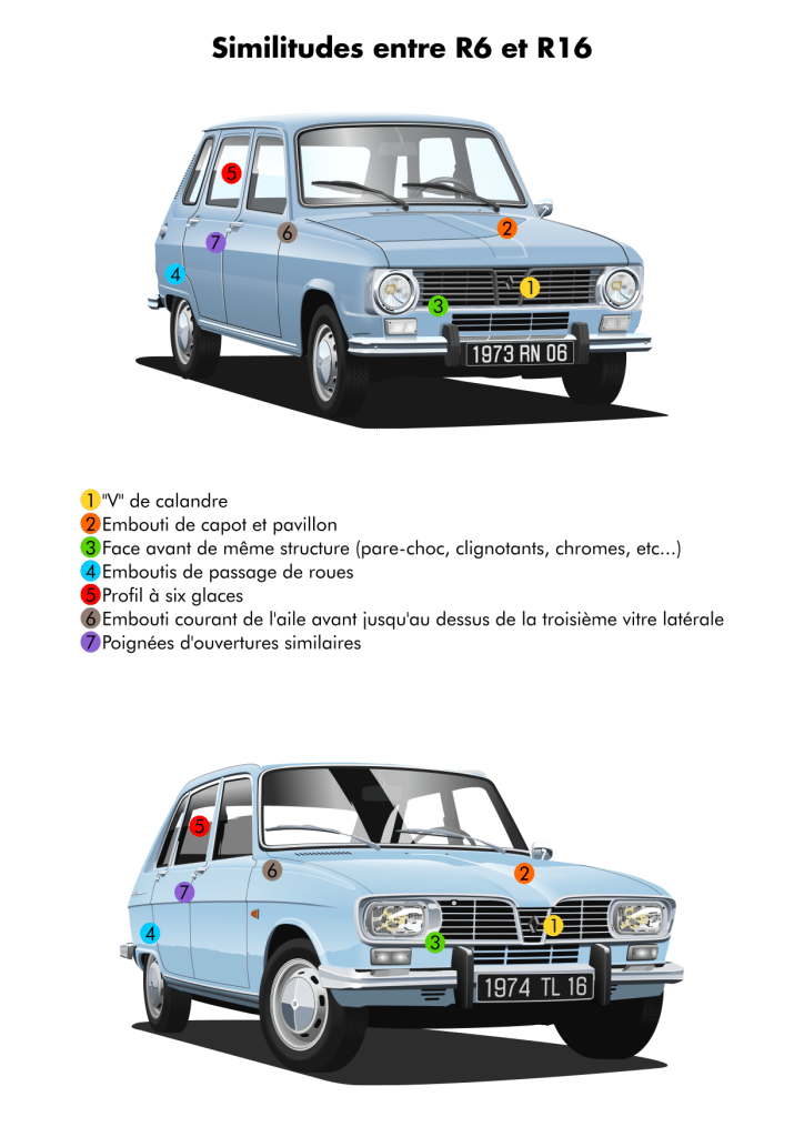 Pour vous rafraichir la mémoire, je vous propose des illustrations de notre sujet du jour dans sa configuration d’origine en phase 1. Proposée à partir de 1968, cette compacte était destinée aux propriétaires de Renault 4 qui aspiraient à monter en gamme, avoir un peu plus de place, de puissance et bénéficier d’un style plus attrayant. Ce dernier est d’ailleurs inspiré directement de la R16 mais il faut bien reconnaître que placer le dessin élancé de cette dernière sur un étroit châssis issu de la Renault 4 ne permet pas d’avoir des proportions aussi harmonieuses. Afin de marquer plus nettement la filiation, on va donc reproduire certains emboutis et traits de caractère de la grande sœur. Certains seront d’ailleurs repris ultérieurement sur les 12, 15 et 17. Je vous laisse découvrir ceux-ci sur l’illustration ci-dessous.
